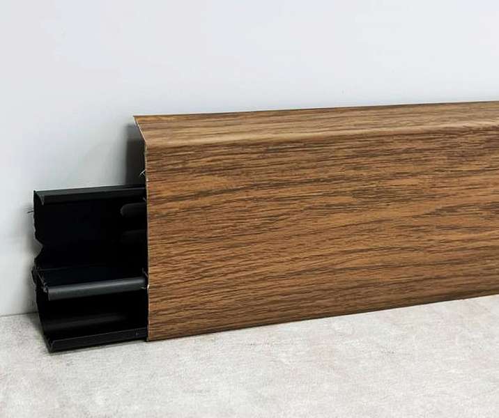 Высота плашек – 70мм. Она позволяет заводить под плинтус стеновые панели и полностью закрывать технические зазоры между стеной и покрытием пола. Можно не выравнивать стены и пол в месте их стыка.